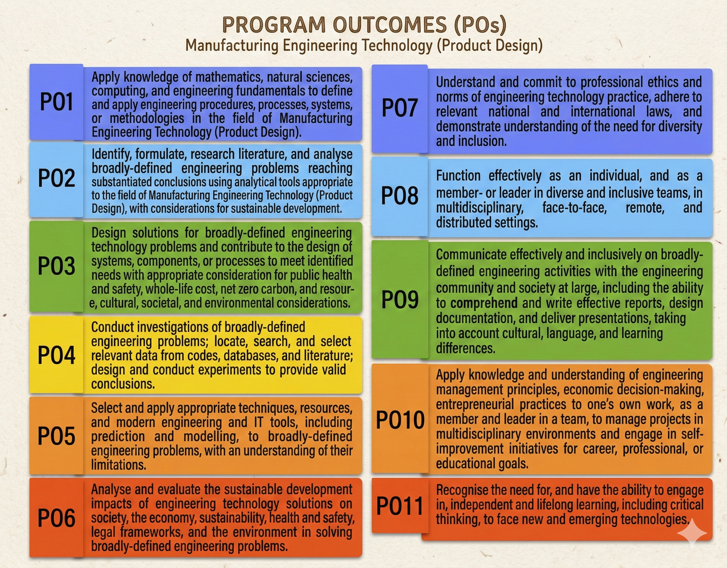 PO1 - Apply knowledge of mathematics, natural sciences, computing, and engineering fundamentals to define and apply engineering procedures, processes, systems, or methodologies in the field of Manufacturing Engineering Technology (Product Design)