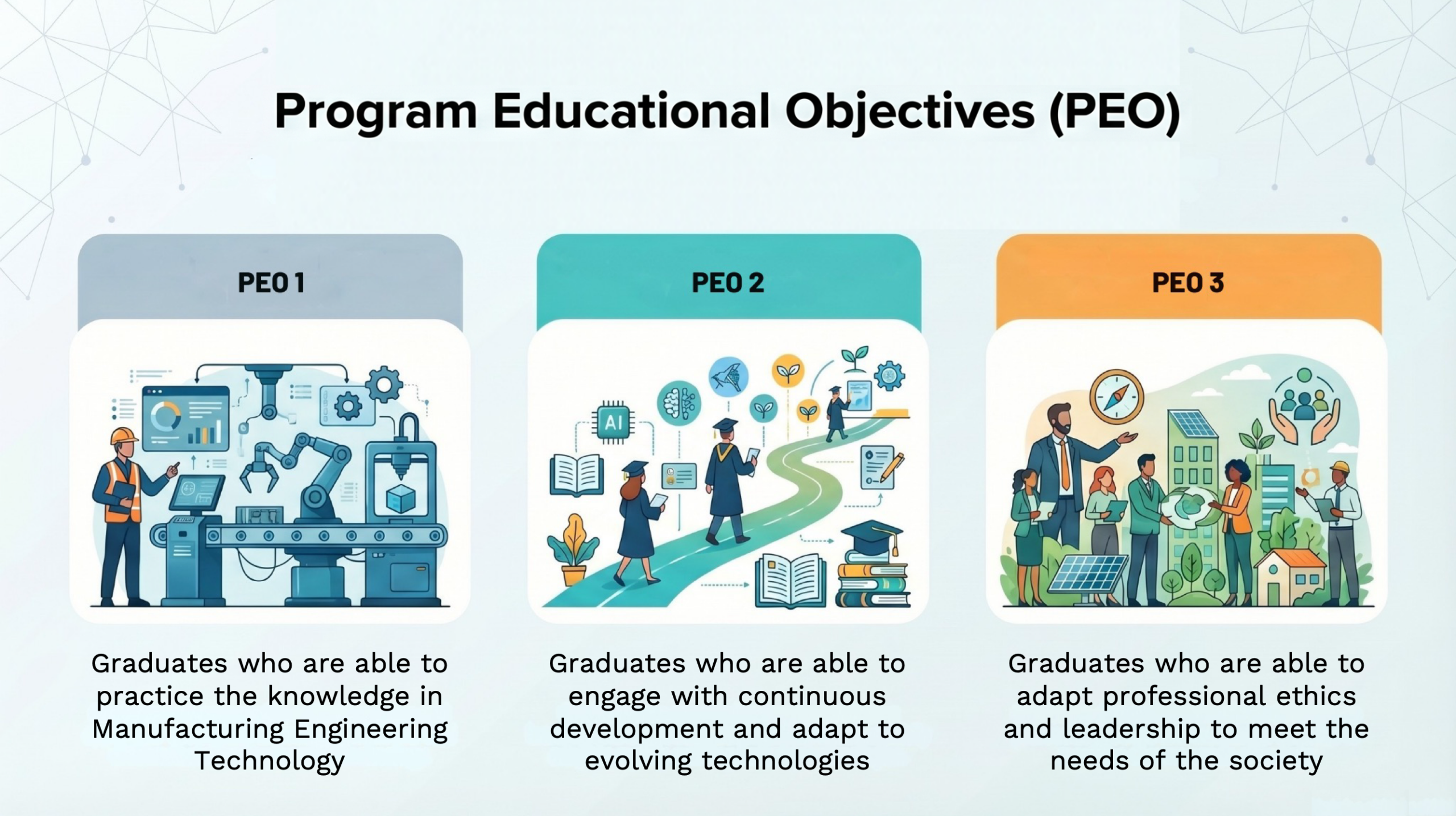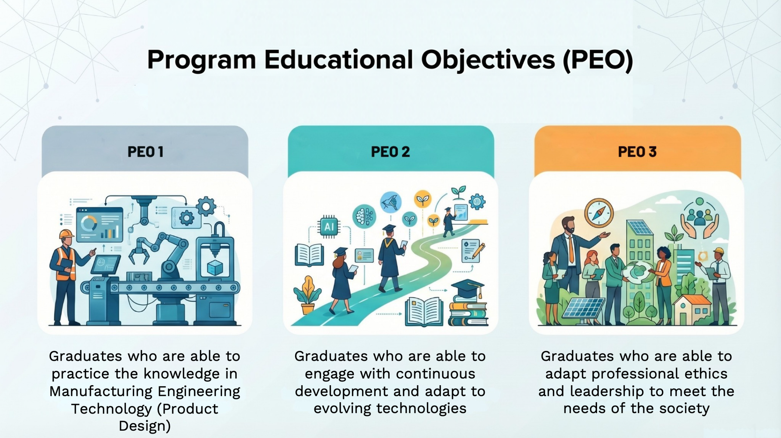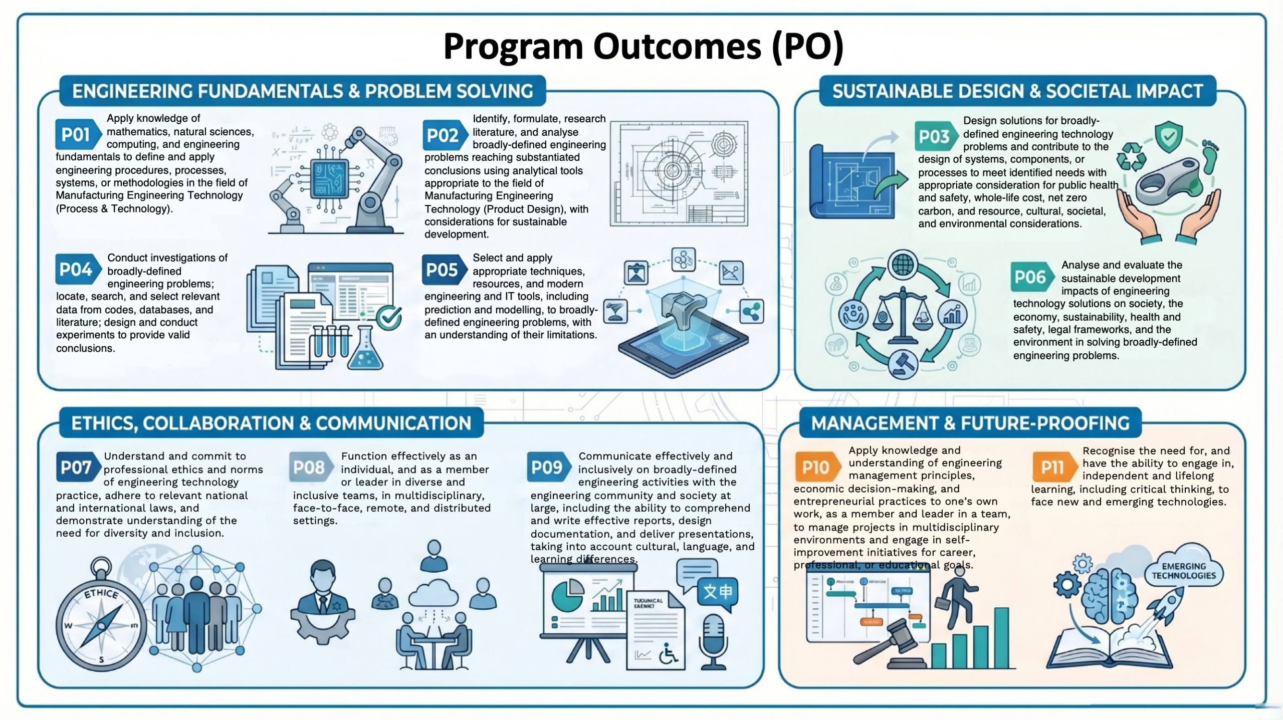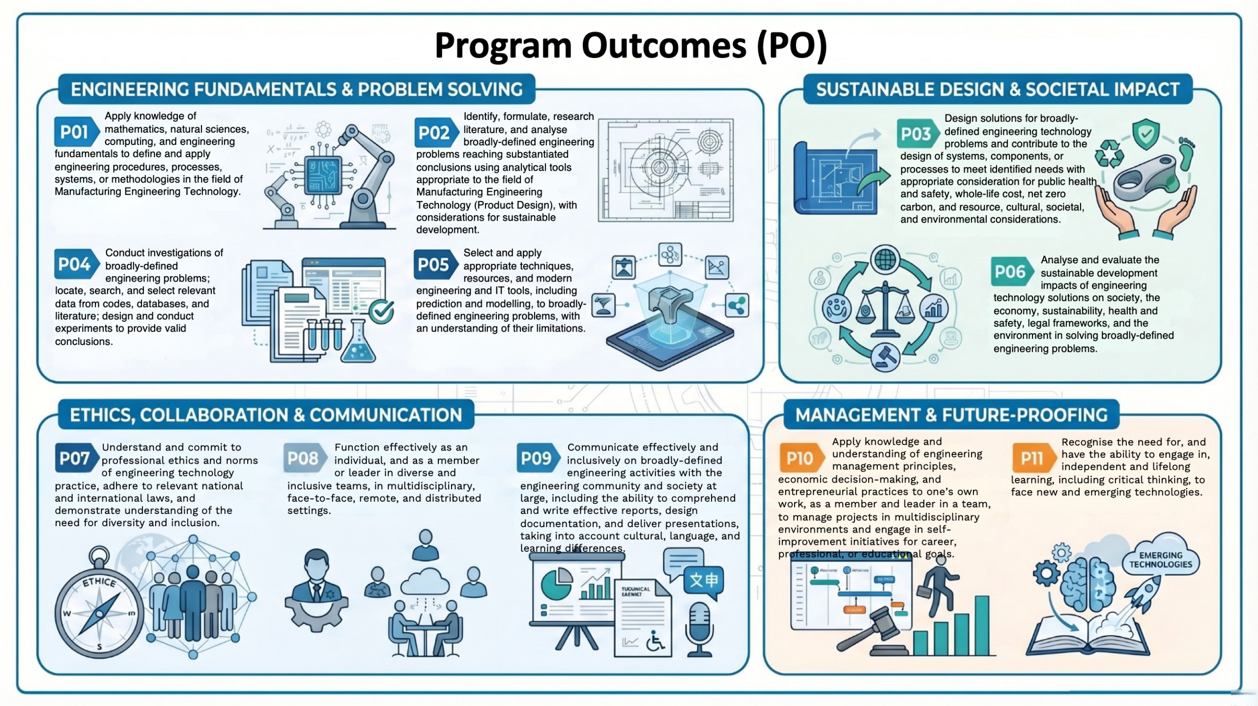The Bachelor of Manufacturing Engineering Technology in Product Design program merges engineering, design, and technology principles to develop innovative products. It aims to build technical proficiency, creativity, practical experience, interdisciplinary collaboration, and a focus on sustainability and ethics.This program equips students with a balanced education in engineering, design, and technology, preparing them to lead and innovate in the product design industry.